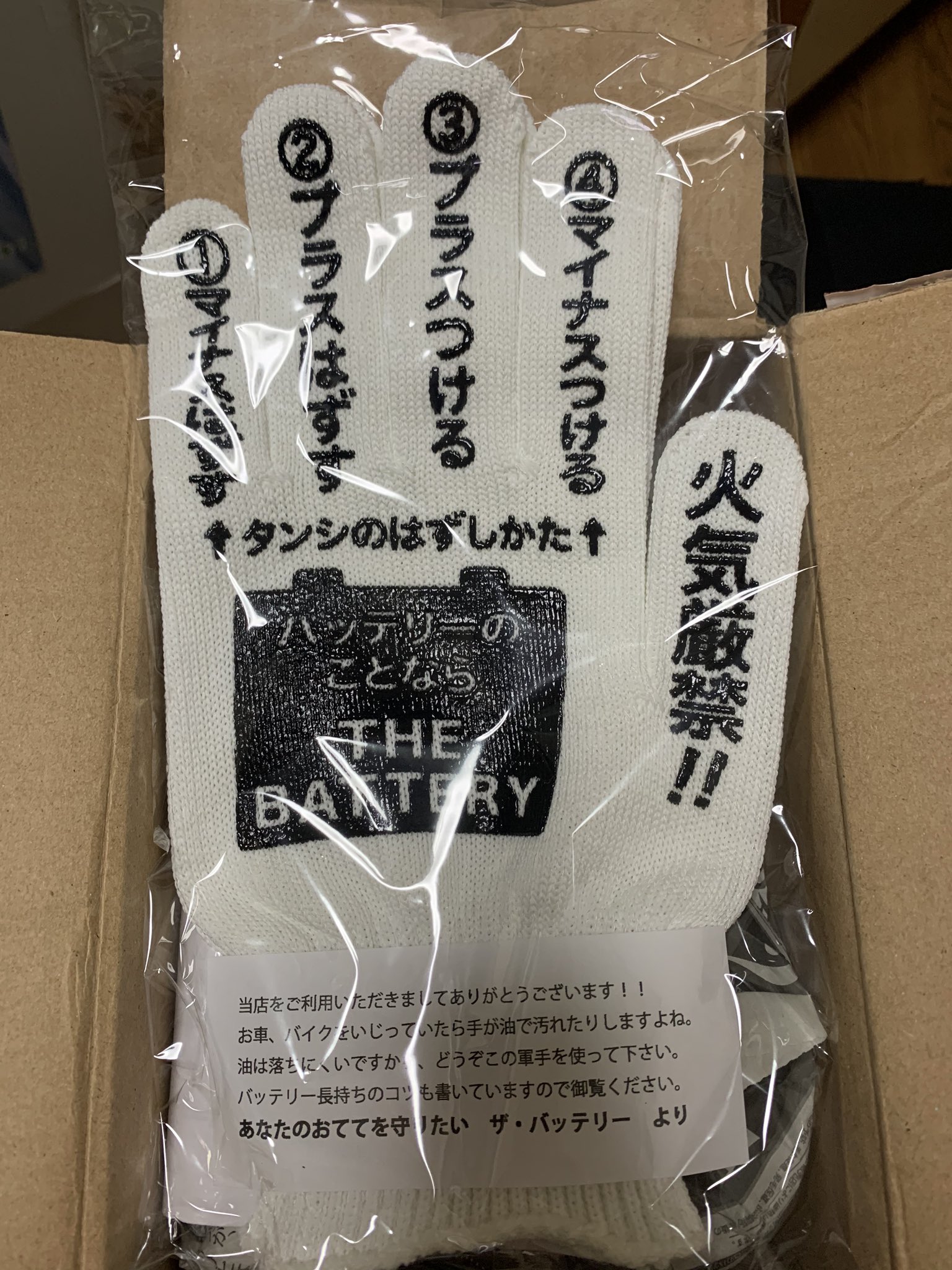 Ayasen アヤセン Avril Johnson バッテリー新しいの買ったのだが開けた瞬間びっくり 頼んでもない軍手が入ってると思ったらなんとサービス品でした マイナスとプラスどっちが先やったっけーっていちいちネットで調べる手間も省けますね いいアイデア