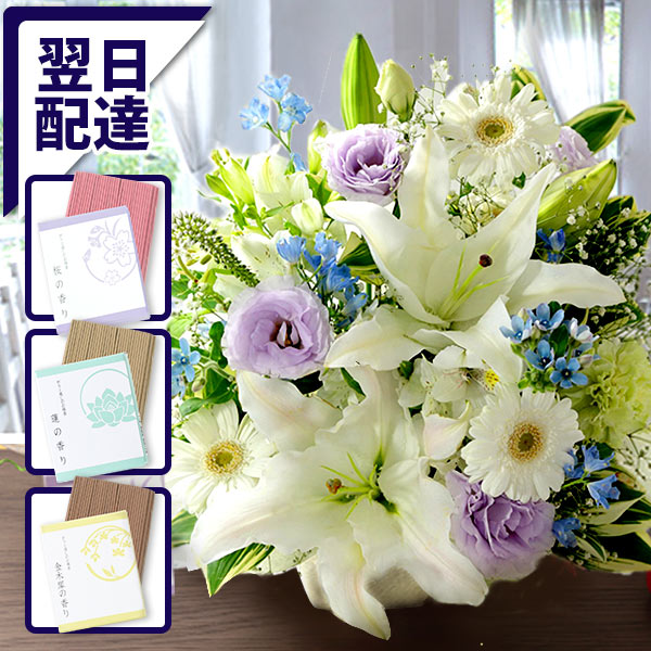 人気sale 低価 お供え お悔やみ 花 フラワーアレンジメント 法事 お供え物 お供え花 仏壇 命日 一 生花 アレンジメント ユリ入llサイズと4種のお線香 花げしき のセット 即日発送 お供え 線香 セット